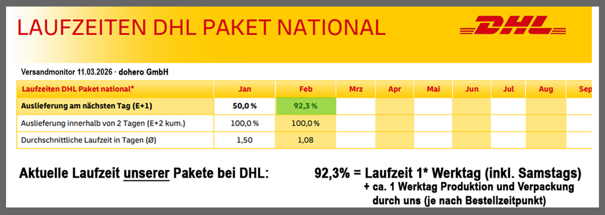 Der Versand wird mit DHL durchgeführt und beinhaltet selbstverständlich eine Trackingnummer, mit der du deine Bestellung jederzeit nachverfolgen kannst.